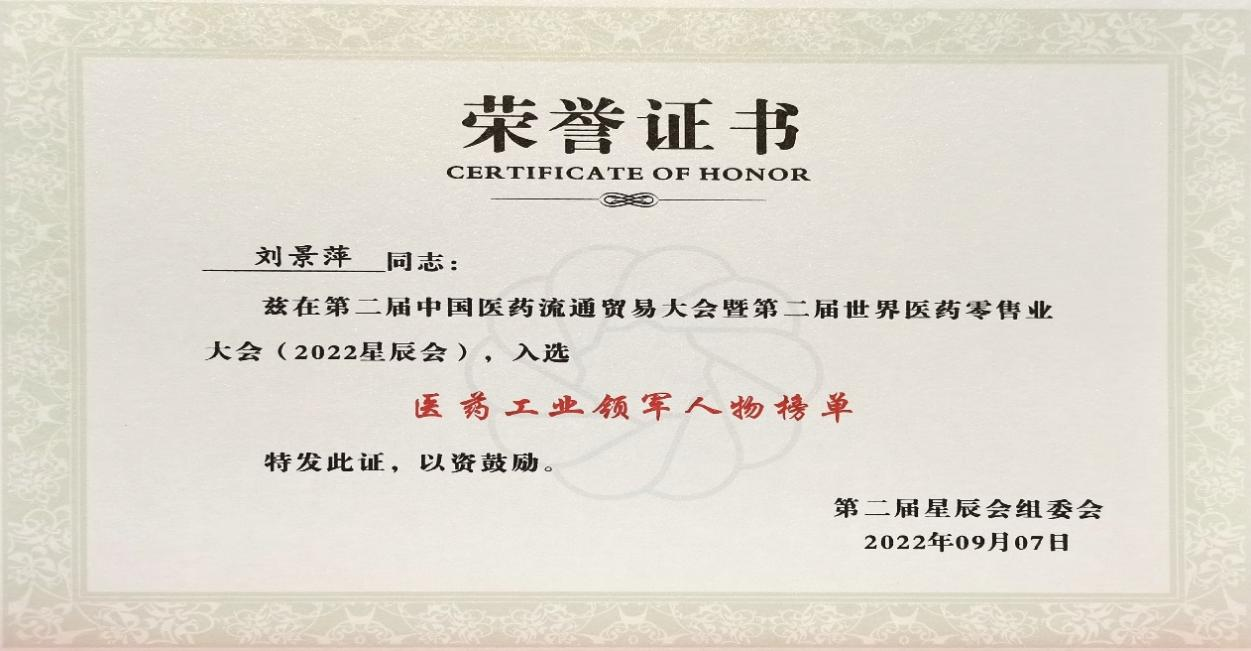 在本次开幕式上,发布了“医药工业领军人物”、“医药零售领军人物”榜单,4556银河国际药业集团刘景萍董事长凭借在儿药领域多年的努力探索和对行业的杰出贡献,荣获“医药工业领军人物”称号。